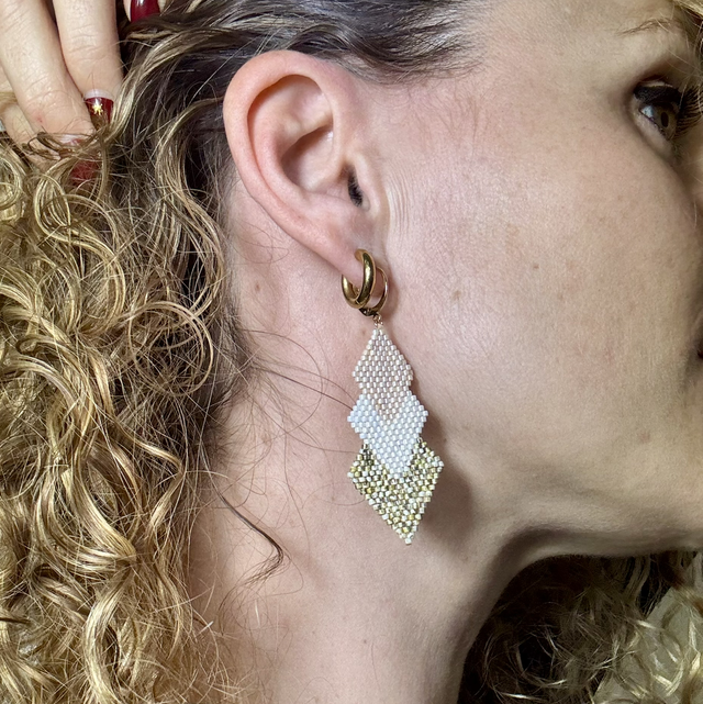 Douces, lumineuses et élégantes, ces boucles d’oreilles en forme de losange sont entièrement tissées à la main avec des perles de rocaille. Le dégradé harmonieux de beige chaud, blanc lumineux et doré délicat apporte une touche naturelle et raffinée, facile à associer à toutes les tenues.